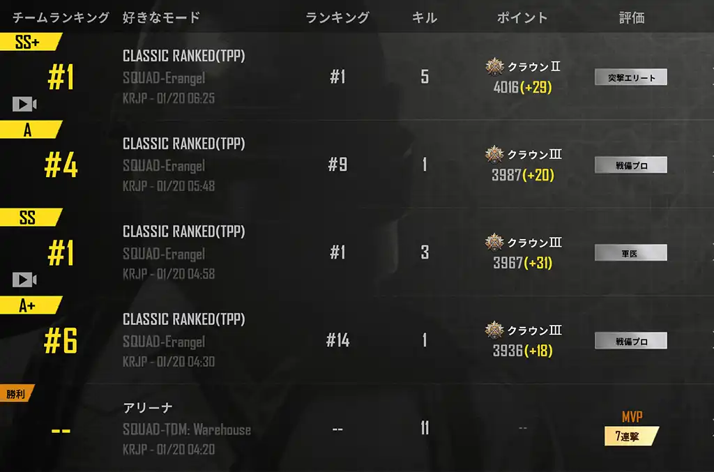 今日は4戦して2ドン勝。レートは98上がりました。このままいけば週末にはエース昇格戦ができるかもしれませんが、最近調子よくレートが上がり過ぎです。