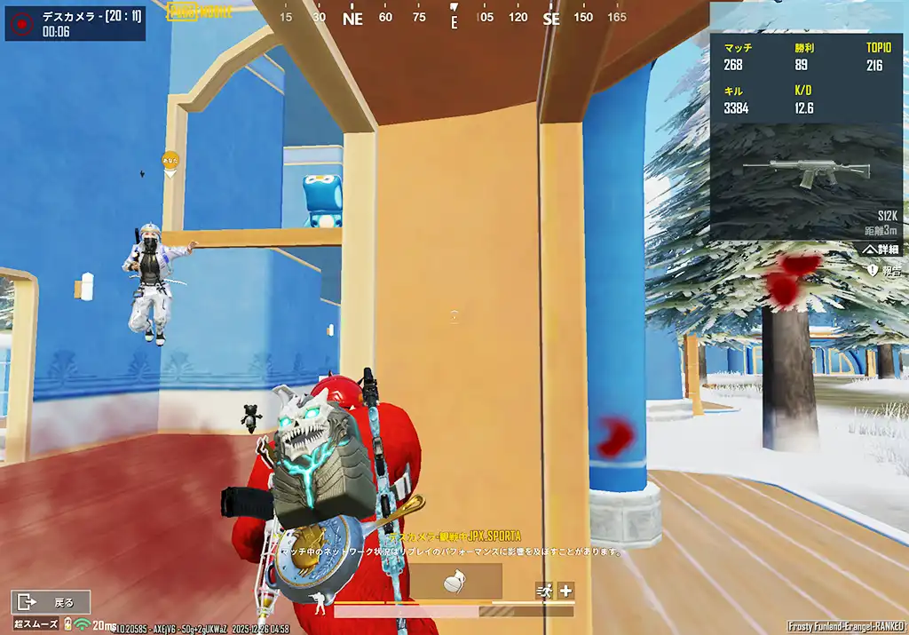 と思い、ソセポにいる敵に「雪国Kar」を数発撃ち込みました。残念ながらSRは下手なので敵に当てることはできませんでしたが、なぜか家の中が雪まみれ。